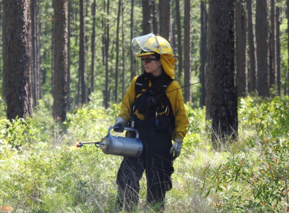 Aimee Wolters holds a drip torch while talking with burn boss, Aaron Miller. Note the uniforms and the safety gear. Yellow Nomex shirts, cotton trousers, leather boots, bright yellow helmets, face shields, goggles, radios for communications, fire shelters and whistles are all standard issue equipment for those working on prescribed fire.