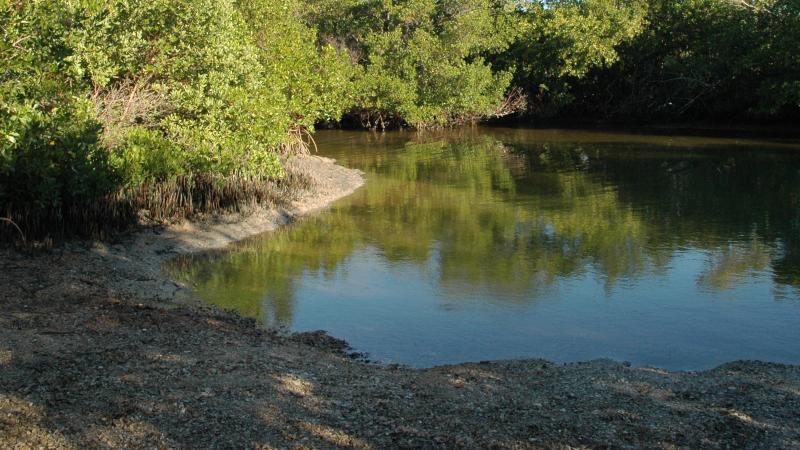 Framed in forests of mangrove trees, the shell mounds and ridges of Mound Key rise more than 30 feet above the waters of Estero Bay.